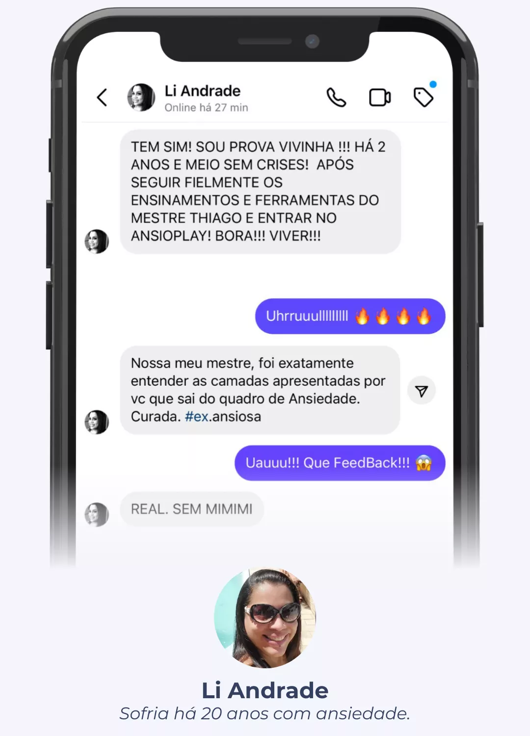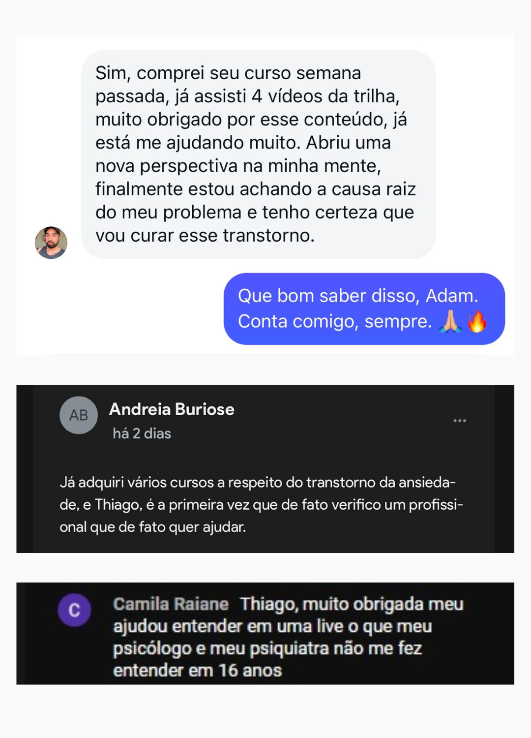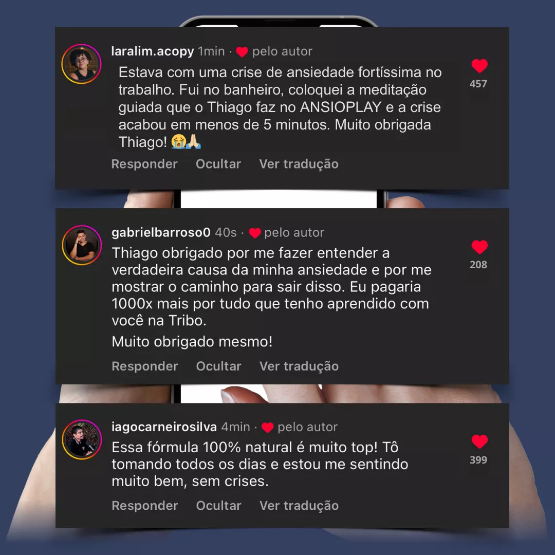 Como aluna(o) do ANSIOPLAY, você terá a oportunidade de participar da TRIBO Sem Ansiedade, onde será acompanhada semanalmente pelo Thiago Almeida, para tratar a verdadeira causa do transtorno de ansiedade: a 4ª camada da personalidade.