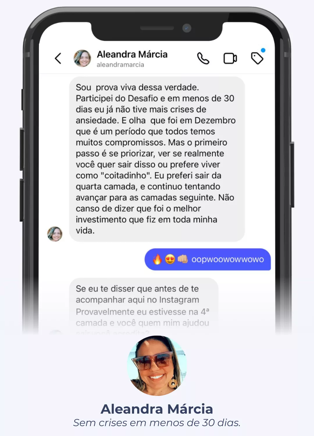 Sem entender o que é a 4ª Camada da Personalidade e aprender a sair dela imediatamente, é impossível acabar com o transtorno de ansiedade. Você terá a possibilidade de ser acompanhada por mim, semanalmente, para tratar isso na TRIBO Sem Ansiedade.