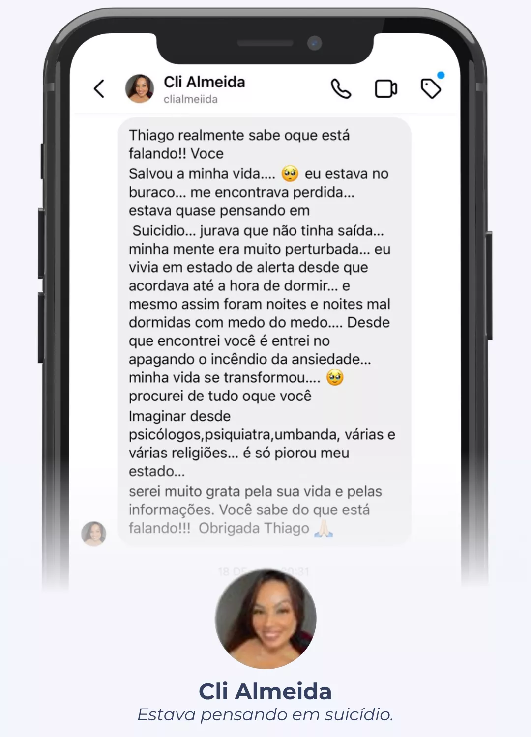 Você terá acesso imediato ao aulão onde explico o método que já tirou mais de 5.000 pessoas dos transtornos de ansiedade; e, após 7 dias, terá acesso a todos os bônus.