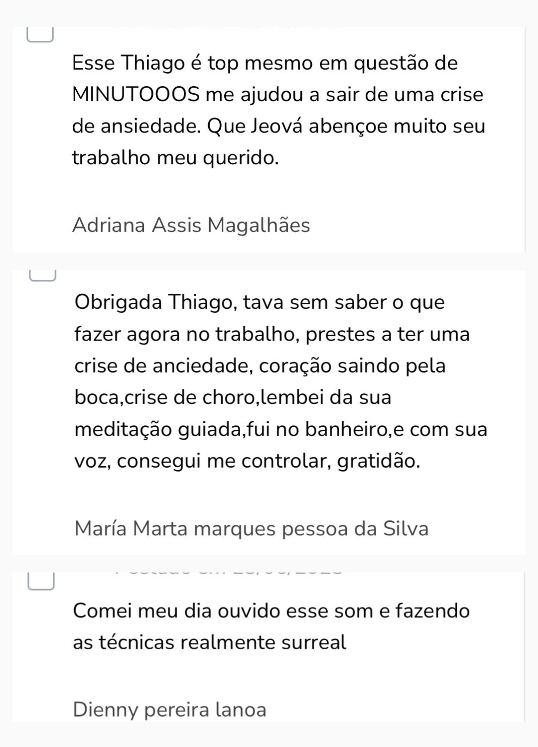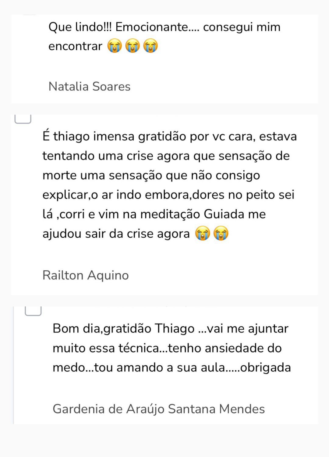 Além de aprender a produzir serotonina de forma natural (a serotonina é o principal hormônio que controla os sintomas da ansiedade), você terá acesso a uma meditação guiada que acaba com qualquer crise de ansiedade em menos de 5 minutos, é só apertar o “play”.